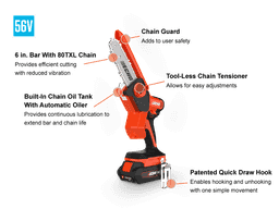 The DHS-3006 combines lightweight convenience with the power of the ECHO 56V Battery System. Designed for pruning and small limbing tasks, it features a 6 in. 80TXL cutting system for clean, precise cuts every time. A powerful brushless motor with MAXOUT™ technology delivers gas-like performance, ensuring maximum efficiency and reliability on every job.