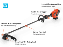The DSRM-225 delivers the convenience of battery power with the strength of gas performance. Its top-mounted motor provides consistent cutting power and control, while the Speed-Feed® 400 trimmer head allows for quick, hassle-free line reloading. With a choice of 14 in. or 16 in. cutting swath, and a durable carbon fiber shaft, this trimmer is built for efficiency and long-lasting performance. An integrated display keeps you informed on battery and power levels, so you can work without interruption.
